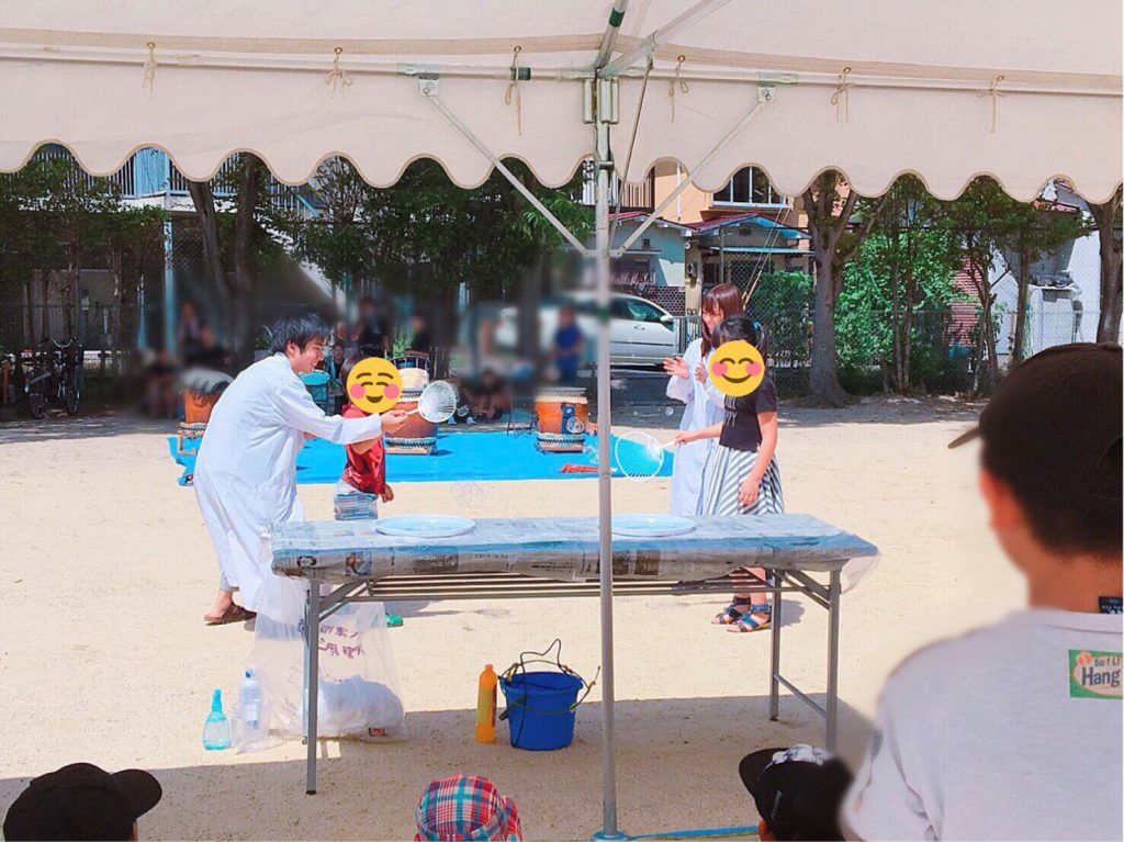 保育園ほいくえんのみなさんにたのしんでもらえるよう、じーっくりかんがえて、面白おもしろいショーと実験じっけんってきました。