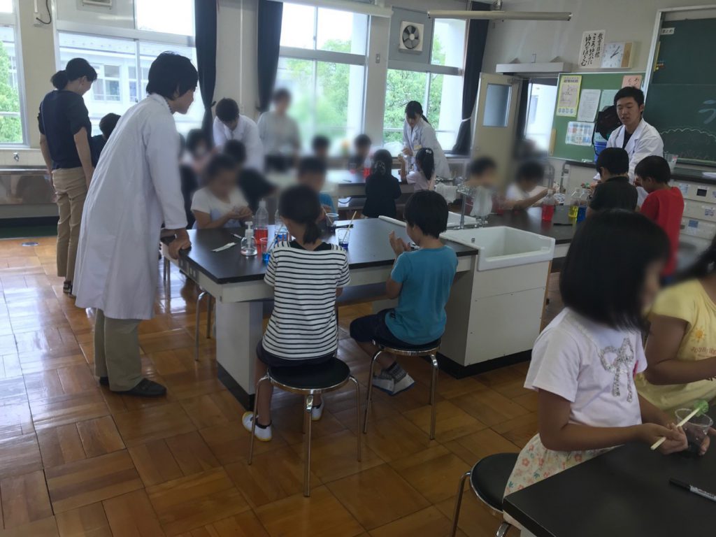 先ほど貼った写真はクロマトグラフィーのやり方を教えている様子ですね。なんでインクが上がるのかと言うことから、考えてもらい、高学年生向けの実験を教えることができたかなと思います。