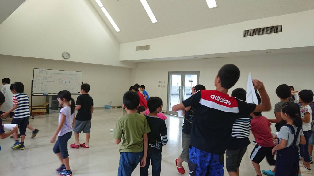 2つ目はジャイロ紙飛行機です。普通の紙飛行機とは形が違いますが、くるくると回転しながら遠くまで飛んでいきます。子ども達は、誰が一番遠くまで飛ばせるか、狙った所に飛ばせるかなど、みんなで競い合うように遊んでいました!